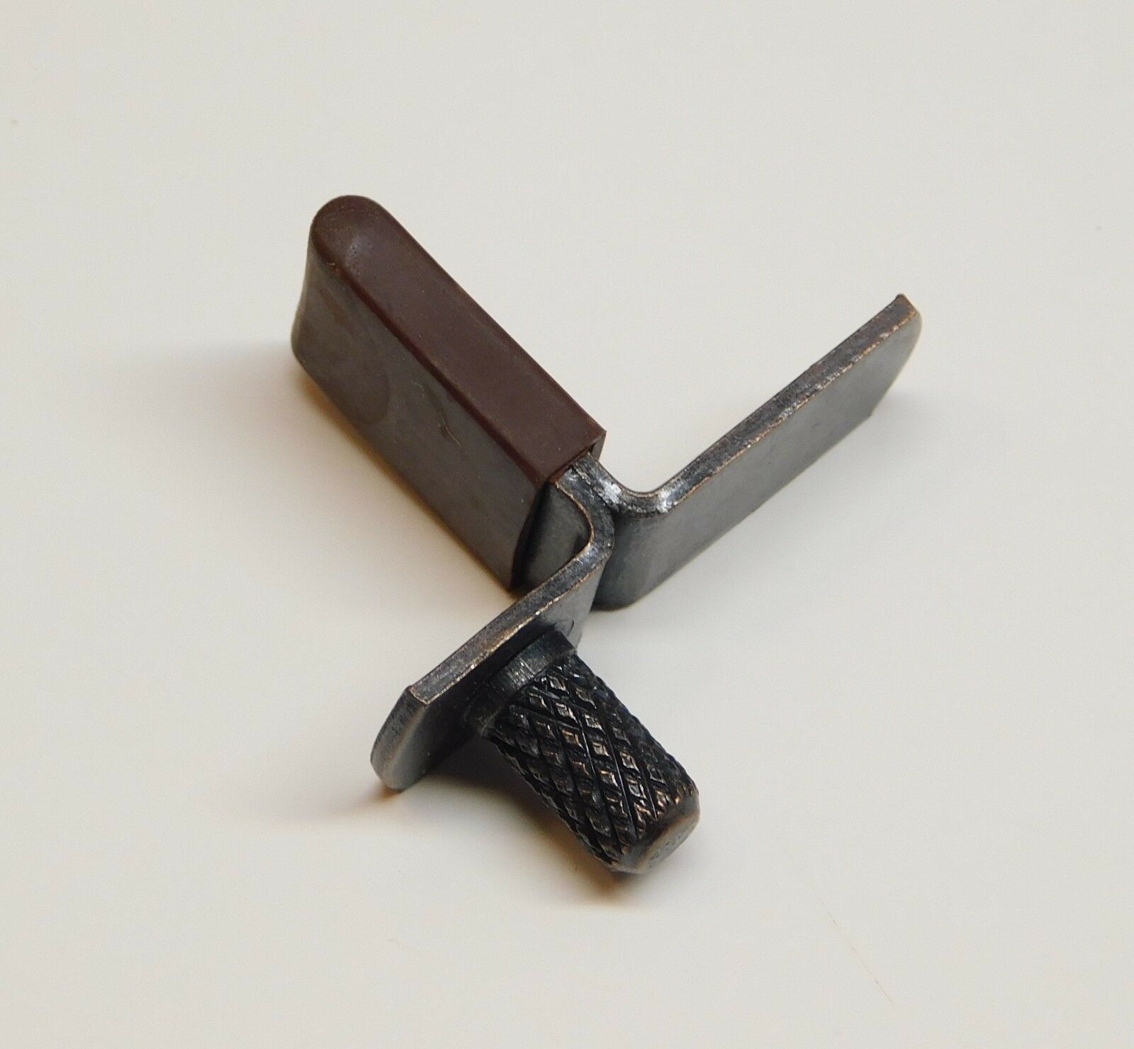 This single glass shelf bracket is made by Howard Miller and is specifically designed for use in Howard Miller and Ridgeway curio cabinets. The bracket is made of metal and has a rubber cover on the area where the glass shelf rests. The post that goes into the hole in the inside wall of the cabinet measures 1/4" diameter. The bracket is about 9/16" wide.
