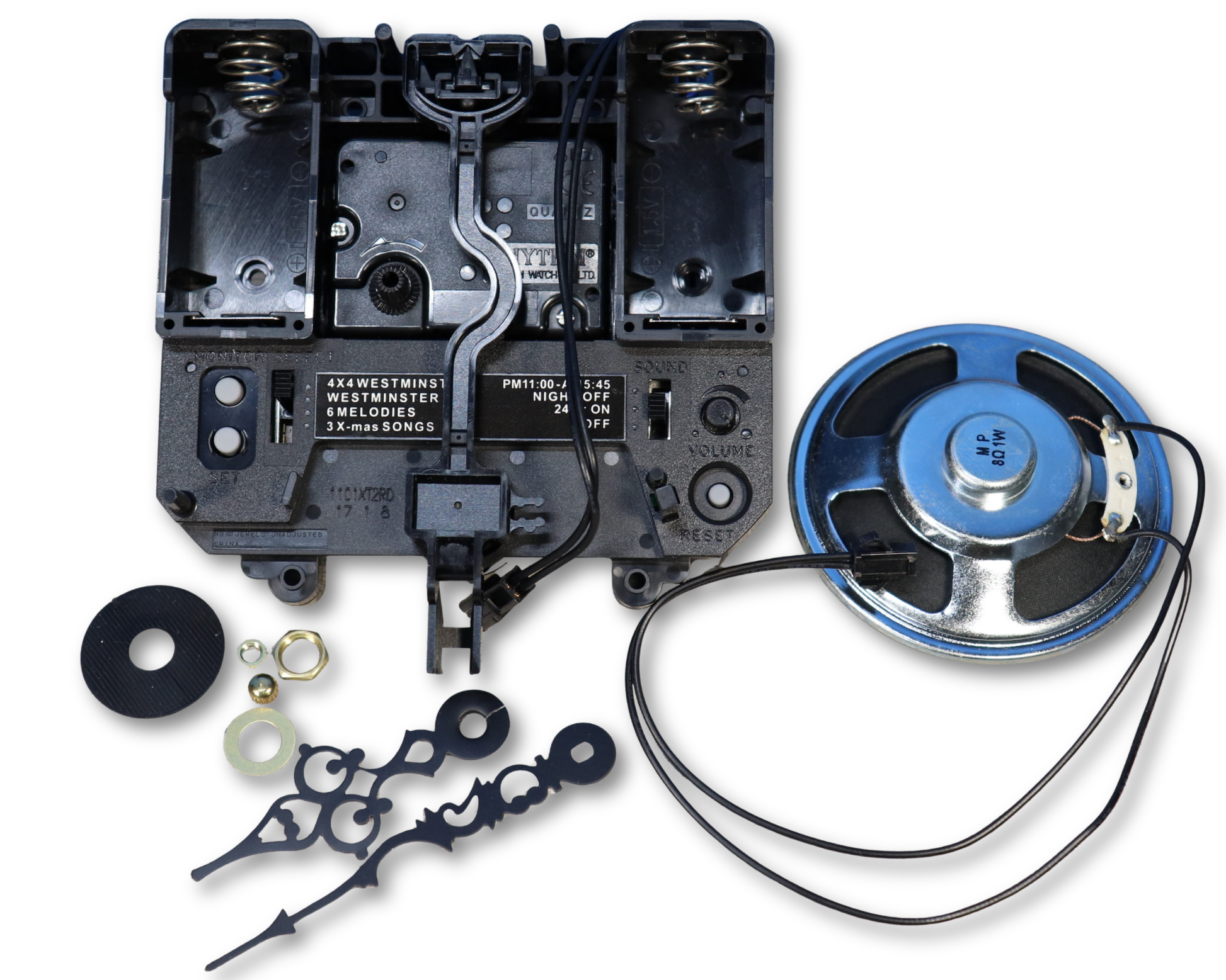 This Rhythm quartz chiming clock movement delivers one of the best tubular bell sounds available in a battery-powered clock movement. Designed for wall clocks, it offers 10 total melodies, rich chime tones, and dependable quartz accuracy.