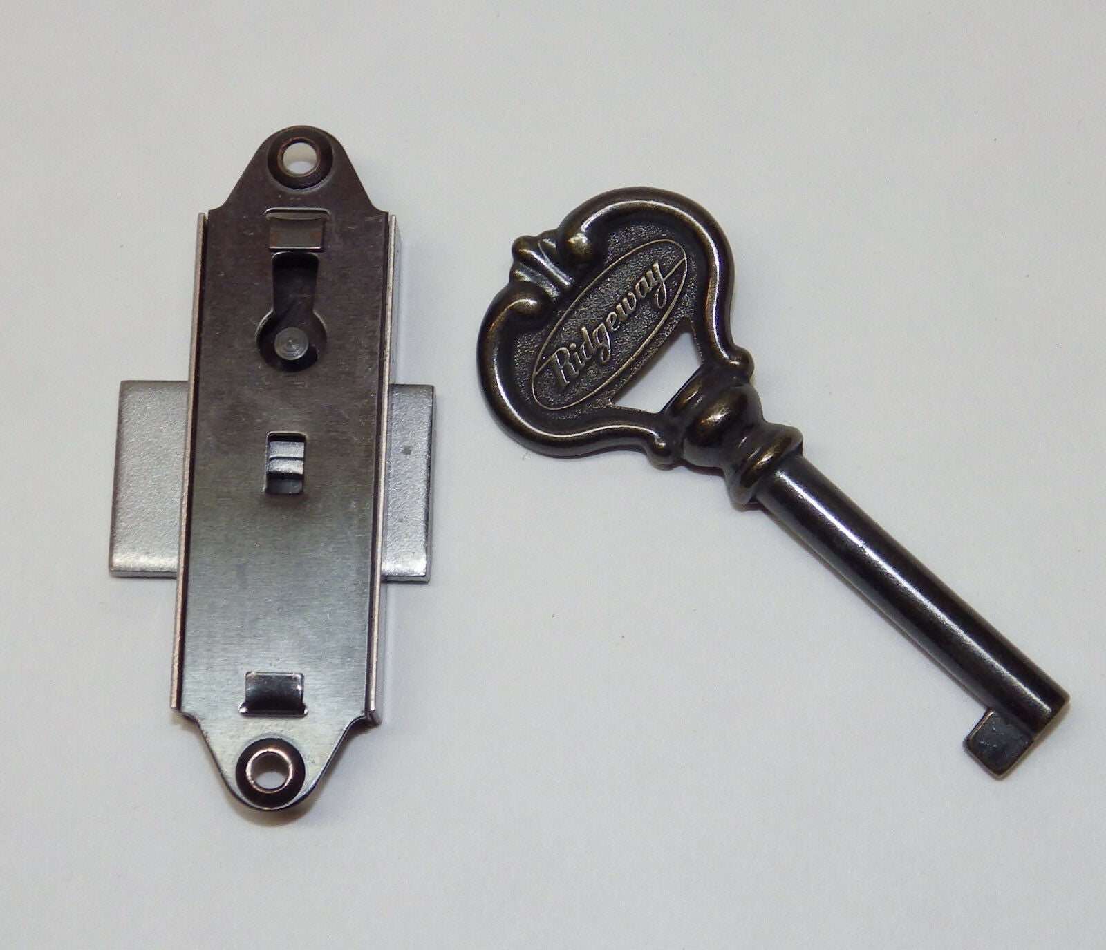 Ridgeway grandfather clock door lock and key set. Narrow style lock with antique brass finish Ridgeway logo key. This fits most modern grandfather clocks made by Ridgeway. Fits up easily in most cases, but you may need to do some modifications to make it work. This depends on how the clock case was originally made. Lock measures approximately 2 3/4" long, 13/16" wide, and 5/16" deep.